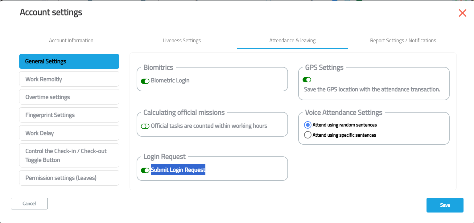 In this mode, the random attendance request is sent to a random percentage of employees. Its settings include: