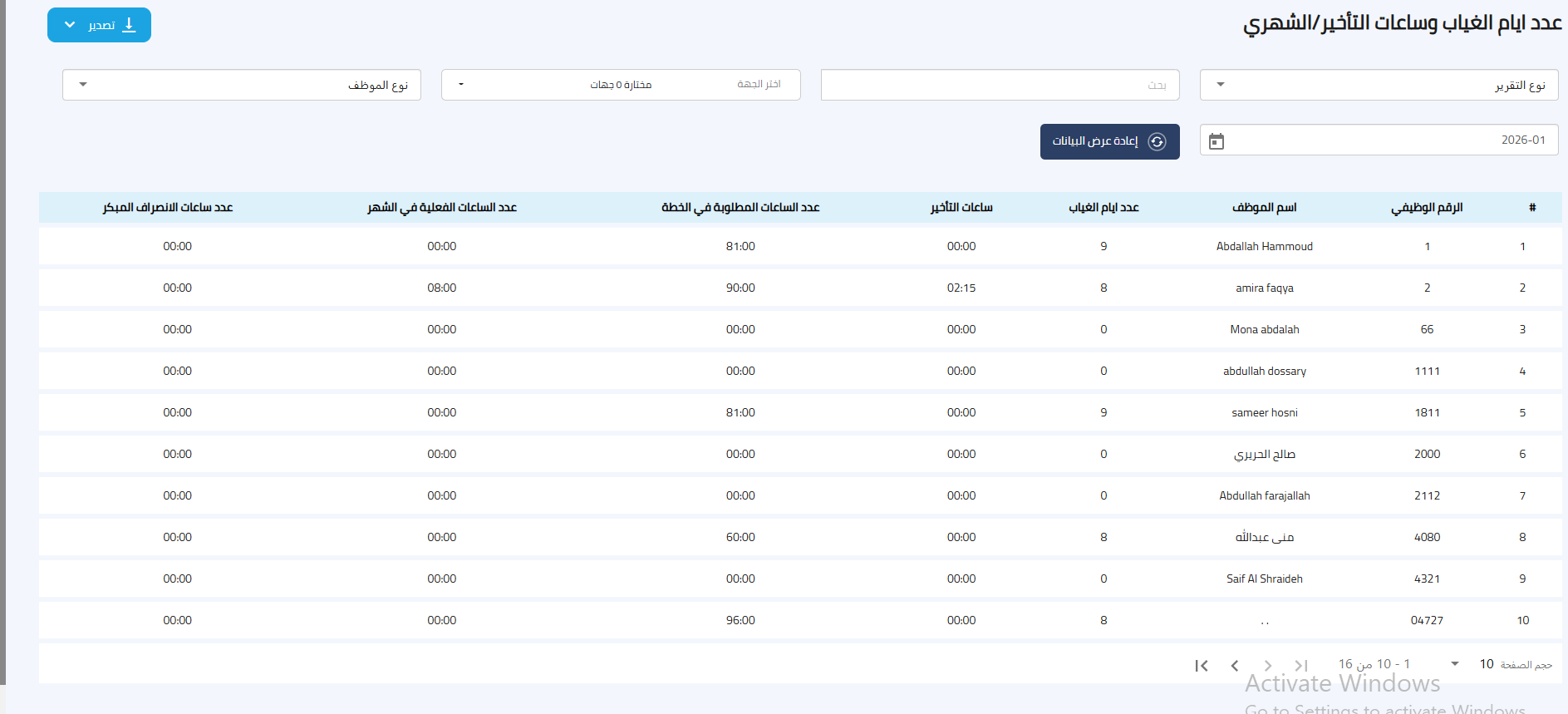 الموظفين المتأخرين: يسرد الموظفين الذين سجلوا حضورهم بعد وقت بدء دوامهم المحدد.