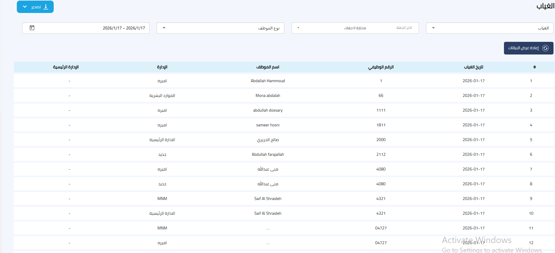 الحضور اليومي: يعرض ملخصًا لأوقات الحضور والانصراف اليومية لجميع الموظفين مع إجمالي ساعات العمل.