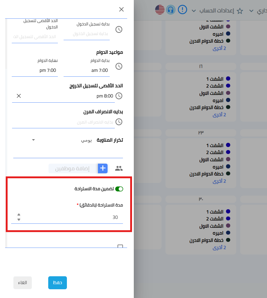 إدارة مرنة للاستراحات: تمنح هذه الميزة المستخدمين القدرة على تفعيل أو إلغاء خاصية وقت الاستراحة المجدول ضمن أي مناوبة عمل.